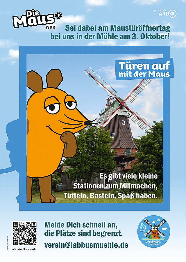Die Windmühle Labbus ist am Aktionstag für Kinder "Türen auf mir der Maus" mit dabei.