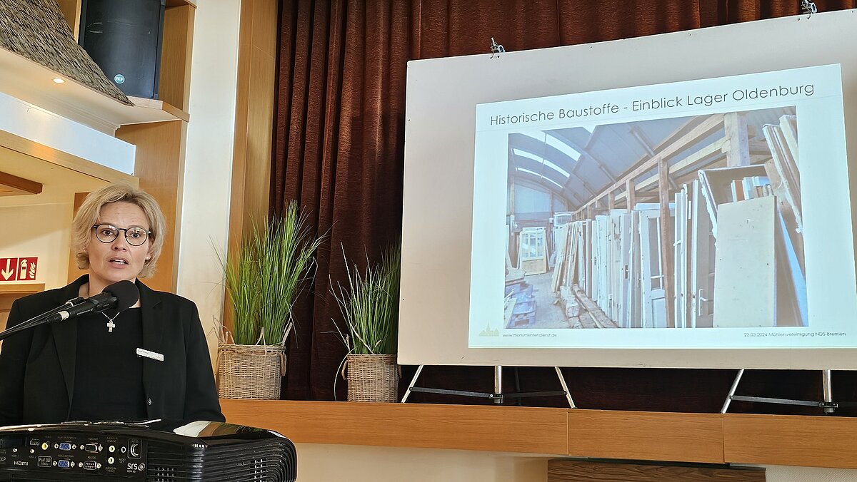 Kerstin Stölken berichtete über die Arbeit des Monumentendienstes. Dieser wurde 2004 nach niederländischem Vorbild gegründet und von der EU unterstützt. Der Monumentendienst ist ein Projekt der Stiftung Kulturschatz Bauernhof und hat seinen Sitz in Ahlhorn und Cloppenburg. Die Zusammenarbeit mit dem Museumsdorf Cloppenburg erwies sich als Türöffner. Dem Monumentendienst geht es nicht nur um Renovierung, sondern auch um Prävention, vergleichbar mit der Prophylaxe beim Zahnarzt, wo man nicht erst die Löcher abwarten soll. Regelmäßige Inspektionen können hohe Kosten ersparen. Im Fokus stehen Gebäude von vor 1945 sowie weitere besondere Gebäude, die unter Denkmalschutz stehen. Der Dienst verfügt über spezielle Geräte wie einem Mühleninspektionswagen, evtl. werden weitere Hocharbeitsgeräte angemietet. Bei Mühlen erweist sich Stillstand als größtes Problem. Wasser dringt in die Gebäude und zieht die Schädlinge und Pilze an. Bei Schädlingsbefall wird zunächst ein Monitoring gemacht, um abzuklären, ob der Befall noch aktiv ist oder ob eine größere Sanierung erforderlich ist. Der Wasserablauf an Mühlen muss immer gegeben sein. Schon durch Kleinstmaßnahmen kann an den Galeriestützen der Wassereintritt verhindert werden. Dies wird vom Denkmalschutz geduldet. Die Reinigung gefährdeter Stellen wie Ecken, Fensterrahmen, Holzeintritt in Mauern etc. ist wichtig, insbesondere die Regenrinnen sollten immer gesäubert werden.