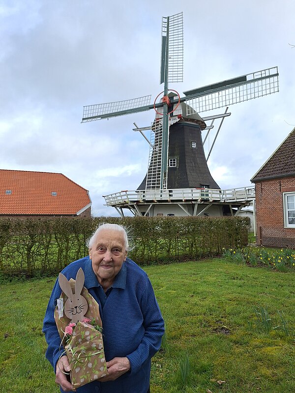 Zum 95. Geburtstag von Eke Thaden von der Seriemer Mühle in Neuharlingersiel gratulierten Bea Tilanus und Marion Kruse mit einem österlichen Blumengeschenk, das sie dem Sohn Claas Thaden überreichten.